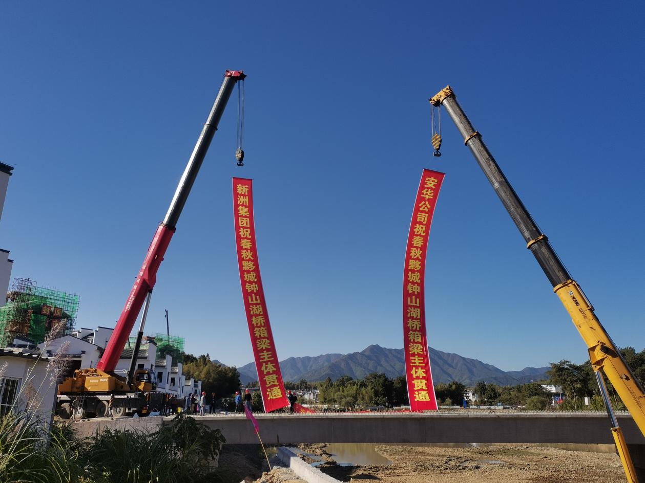 10月13日14時(shí)48分,黃山新洲集團(tuán)承建的春秋黟城鐘山湖橋箱梁主體架設(shè)順利貫通。該橋梁全長118.0m,屬于大橋,全寬11m,按橫橋向整幅設(shè)計(jì)。本橋梁設(shè)計(jì)上部結(jié)構(gòu)采用3×35m預(yù)應(yīng)力混凝土箱梁,每跨由4片箱梁組成,梁高為1.8m,頂板寬2.4m,底板寬1m,懸臂根部高0.25m,端部高0.18m,腹板為斜腹板。
