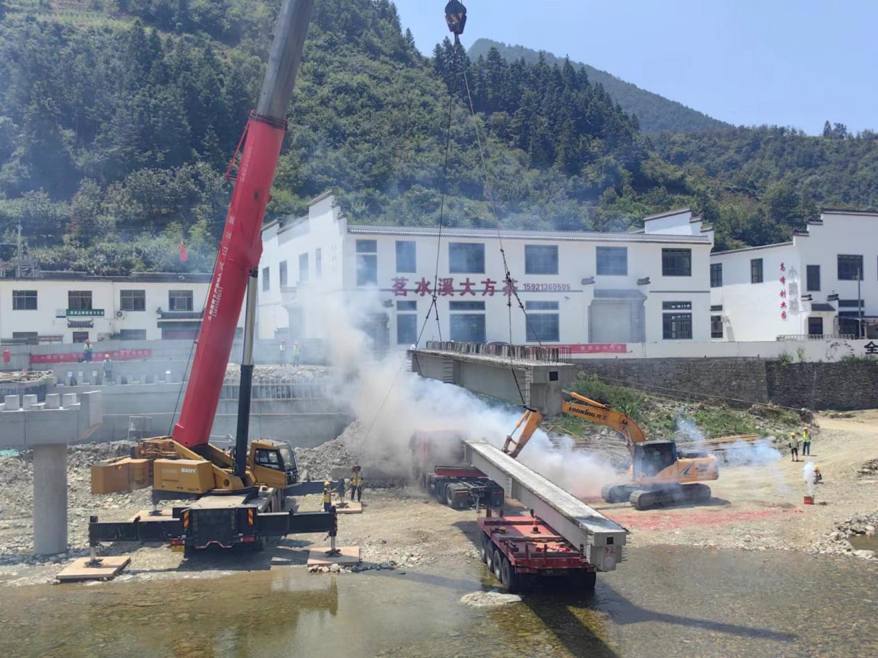 連日的持續(xù)高溫?fù)醪蛔≈啡说牟椒ィ?月5日上午,炎炎烈日之下,隨著煙花爆竹的一聲聲爆炸,我公司承建的歙縣三陽-英坑河口農(nóng)村道路改建工程,K1+148線外橋第一片梁板架設(shè)成功。