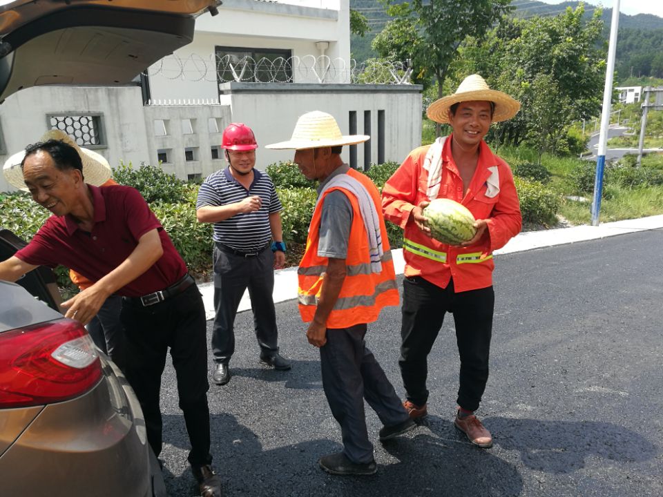 本次專項檢查活動涉及到瀝青拌合站及三個瀝青作業(yè)施工班組、八個在建項目,安全環(huán)保部經理吳正晨向現(xiàn)場負責人提出高溫季節(jié)施工要注意大型機械的防護保養(yǎng)工作,確保工人的安全出行,并做好相應防暑降溫工作,強調了避開高溫時段作業(yè),黨支部書記李惠明向現(xiàn)場施工人員表示慰問,并發(fā)放防暑降溫物品西瓜,仁丹,礦泉水等。